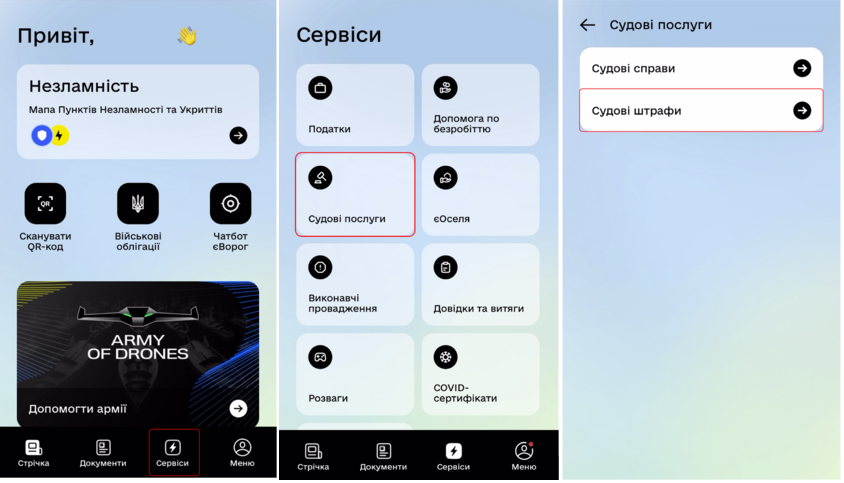 2. Перейти до розділу СервісиСудові послугиСудові штрафи.