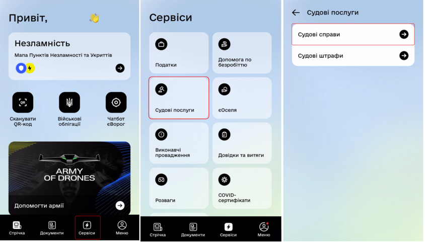 2. Перейти до розділу СервісиСудові послугиСудові справи.